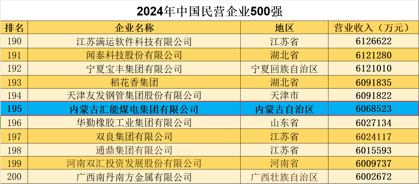 10 月 12 日,全國工商聯發(fā)布 2024 中國民營企業(yè) 500 強報告并公布榜單。匯能控股集團有限公司(原內蒙古匯能煤電集團有限公司)位列榜單195位,較2023年的240位前進44位。